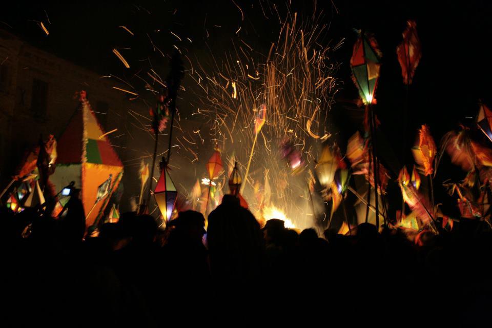 Alle 19,00 in punto tutta l’illuminazione pubblica del Paese di spegnerà, e sarà allora che verranno accese migliaia di lanternine fatte con canne intagliate ad un’estremità a forma di rombo a più facce, rivestite di carta velina colorata e all’interno una candela ad illuminare il tutto: si può partire per la Sfilata de li MOCCULE. Tradizionale sfilata/processione pagana da Piazza Umberto I a Piazza San Pietro con battaglia finale, falò e salto del fuoco.