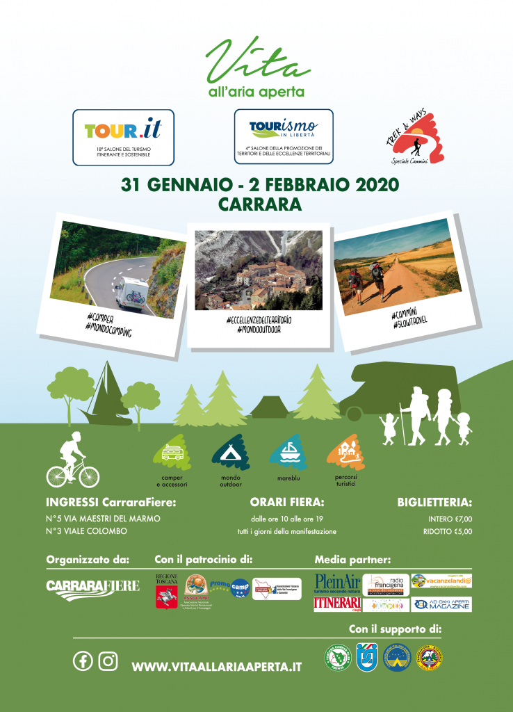 È sempre più ampio il ventaglio di opportunità rivolto agli appassionati di natura e avventura che visiteranno, dal 31 gennaio al 2 febbraio, “Vita all’Aria Aperta”: la manifestazione di CarraraFiere allarga i suoi orizzonti affiancando alla vasta esposizione di camper, accessori e piccola nautica della 18° Tour.it i saloni TOURismo in Libertà, alla quarta edizione, e il format Trek&Ways, un grande luogo di aggregazione dei principali cammini nazionali e internazionali, da Santiago alla Via Francigena, citando solo i più conosciuti, che proporrà un ricco calendario di incontri a tema e numerose attività outdoor per grandi e piccoli.