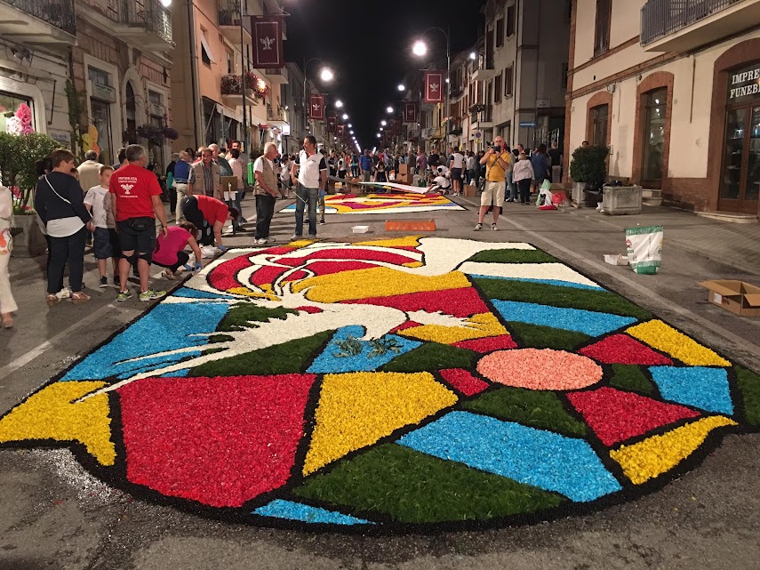 Ne scaturiscono veri e propri capolavori di arte popolare che prendono forma, petalo su petalo, con l’utilizzo di quintali di fiori freschi primaverili, tra i quali ginestre, essenze naturali ed oltre 100.000 garofani che vanno a comporre, come in un fiabesco mosaico, un unico, fantasmagorico, multicolore e soffice tappeto che copre una superficie di più di 1000 mq.