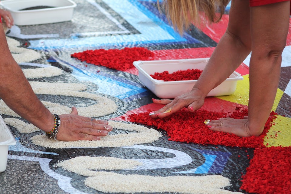 Ne scaturiscono veri e propri capolavori di arte popolare che prendono forma, petalo su petalo, con l’utilizzo di quintali di fiori freschi primaverili, tra i quali ginestre, essenze naturali ed oltre 100.000 garofani che vanno a comporre, come in un fiabesco mosaico, un unico, fantasmagorico, multicolore e soffice tappeto che copre una superficie di più di 1000 mq.