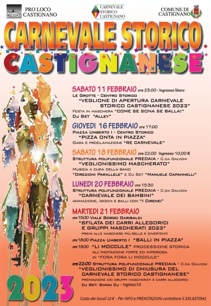 L’apertura dell’edizione 2023 sarà data dal veglione inaugurale, in maschera a tema presso le caratteristiche “grotte” del Centro Storico. Per quest’anno la scelta del tema è ricaduta su “cantanti e band musicali”, con il titolo della serata che sarà “Come s’ sona, s’ balla”. Con inizio alle ore 23, l’ingresso sarà libero e gratuito, ma ovviamente fortemente consigliato in maschera, scegliendo tra gli innumerevoli cantanti italiani e stranieri, oppure interi gruppi musicali, e giocando anche sull’ironia e la stravaganza. Il Dj-set della serata sarà curato dai castignanesi “Alley”.