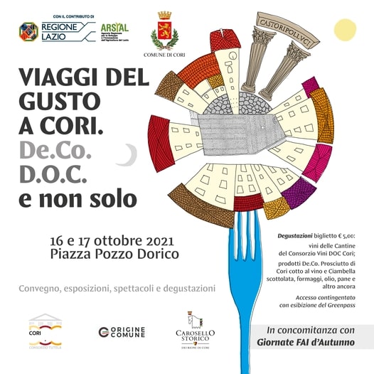 ‘VIAGGI DEL GUSTO A CORI. De.Co., D.O.C. e non solo’ è il nome della due giorni interamente dedicata alle eccellenze e ai prodotti locali, al valore del cibo e del territorio che il Comune di Cori (LT) – Assessorato all’Agricoltura ha organizzato per il 16 e 17 ottobre 2021, con il contributo della Regione Lazio e dell’Arsial e la collaborazione del Consorzio Volontario per la Tutela e la Valorizzazione dei Vini Doc Cori (recentemente costituitosi, primo in provincia di Latina, grazie all’iniziativa del Comune di Cori e delle principali cantine coresi) e dell’Ente Carosello Storico dei Rioni di Cori.
