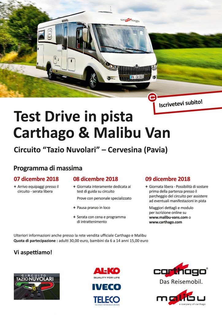 Carthago metterà a disposizione di tutti partecipanti che si saranno iscritti per tempo due autocaravan Carthago su telaio Fiat-Alko, un autocaravan Carthago su telaio Iveco ed un Van Malibu su telaio Fiat, per effettuare un Test Drive sul circuito dove normalmente girano vetture e motociclette da corsa.