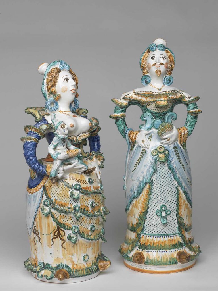 Oltre a piatti, ciotole, coppe, recipienti di varie forme, ci sono i galletti, tipici di Grottaglie, i “pumi”, che si vedono esposti sui davanzali delle case salentine e sono considerati di buon auspicio (ma solo se dati o ricevuti in dono), e la “pupa baffuta“, personaggio nato da una leggenda: un vignaiolo, per sottrarre la giovane moglie alla brutale tradizione dello ius primae noctis (diritto della prima notte) , si travestì da donna per presentarsi al feudatario al posto della ragazza. Dimenticò però di tagliarsi i baffi e fu subito scoperto. Il feudatario ne rise, ma gli chiese, per risparmiargli la vita, che gli portasse tutto il vino prodotto dalle sue vigne in anfore che avessero le sue fattezze travestito. E lui, grazie all’aiuto degli artigiani del paese, glielo portò: nelle anfore a forma di pupa baffuta.
