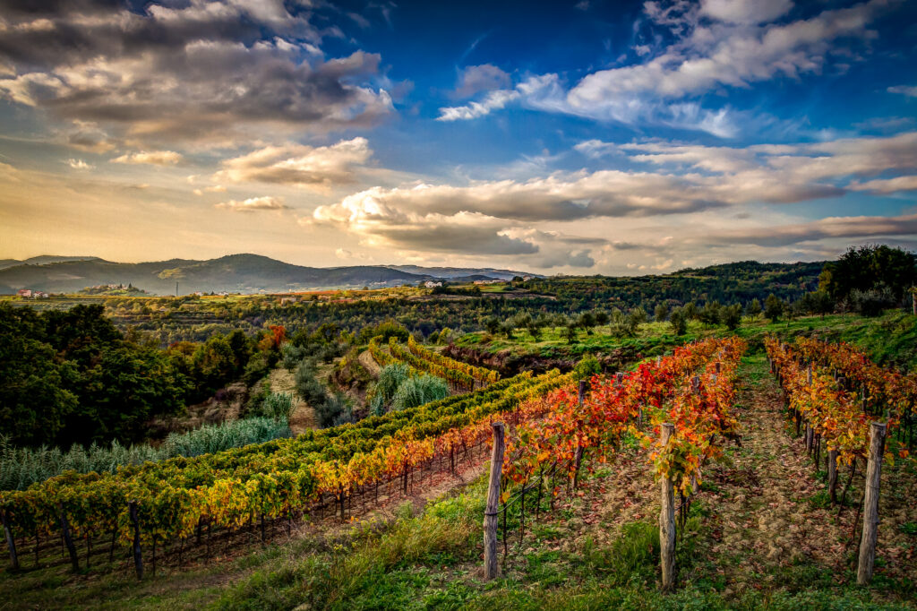 I lievi pendii collinari baciati dal sole della regione istriana sono particolarmente adatti alla coltura della vite, mentre le oscillazioni di temperatura tra giorno e notte accentuano ulteriormente l’intensità aromatica dei vini locali. Tra i vitigni più diffusi ci sono la Malvasia bianca istriana, dall’aroma di fiore d’acacia e dalla freschezza moderata, il Terrano (della famiglia dei Refoschi), vino fresco di colore rosso rubino, noto per i suoi profumi vivaci di frutta, ma anche Pinot bianco, Chardonnay, Pinot grigio, Merlot e Cabernet Sauvignon. Infine non bisogna dimenticare le due varietà del moscato con l’aroma di garofano selvatico, il moscato di Momiano e il moscato rosa di Parenzo. La superficie totale dei vigneti istriani è 6.151 ettari. Per tutti coloro che desiderano immergersi nell’esperienza dei vini istriani, le Strade del Vino della regione offrono un’opportunità imperdibile per visitare le cantine dei viticoltori locali: un viaggio che promette di trasmettere la passione nel salvaguardare i diversi tipi di vino autoctono istriano.