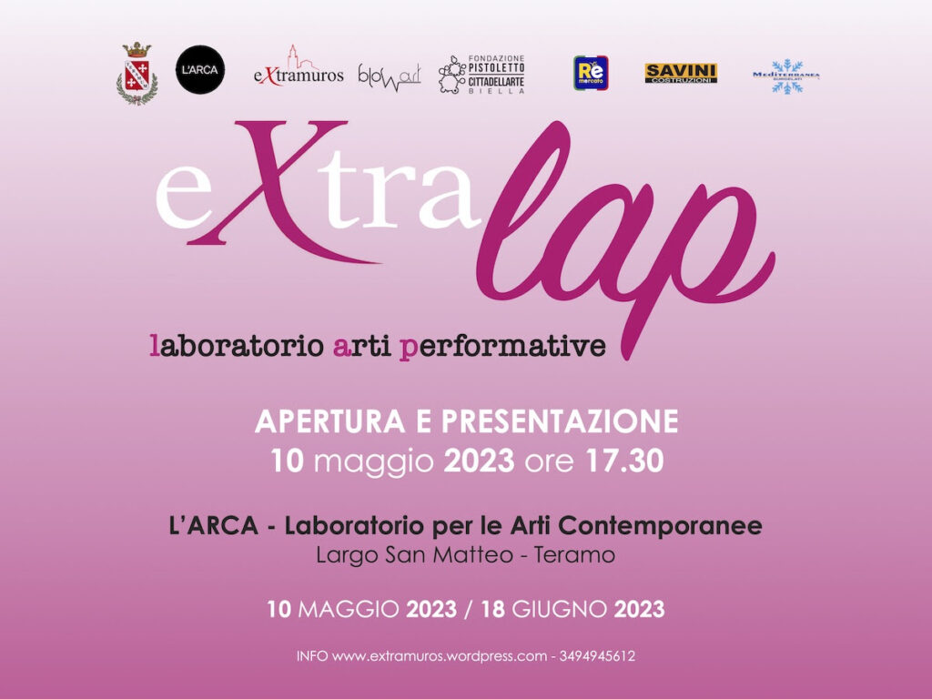 Il 10 maggio 2023 prende il via, presso gli spazi de l’Arca – Laboratorio delle arti contemporanee di Teramo, la prima edizione di eXtralap – laboratorio arti performative, un laboratorio dedicato alla ricerca artistica nel campo delle arti performative, a cura di Roberta Melasecca, all’interno di eXtramuros, un progetto promosso dall’Associazione culturale blowart, coordinato dal consigliere comunale delegato dall’Amministrazione Comunale, Luca Pilotti, con il contributo dello stesso Comune e il patrocinio di Cittadellarte Fondazione Pistoletto.