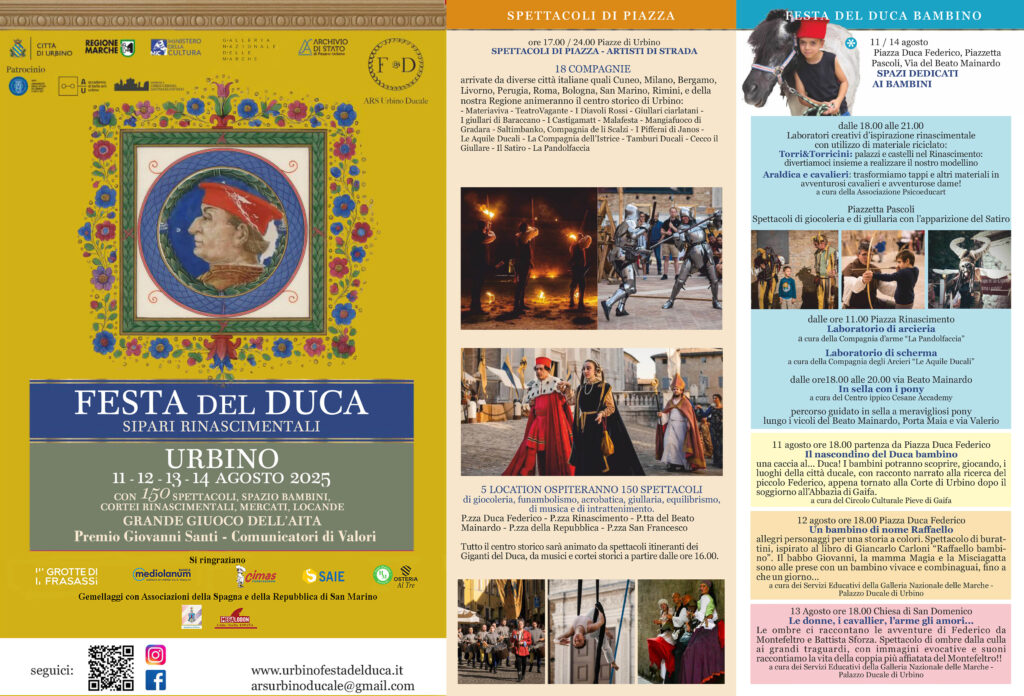 La 43^ edizione della Festa del Duca 2025 è stata potenziata e sarà piena di spettacoli in tutte le piazze e vie del centro storico dalle ore 16.30 quando si aprirà la Festa del Duca Bambino per far giocare e coinvolgere grandi e piccini nei laboratori e spettacoli in piazza Duca Federico (con una caccia al Duca) e in via Beato Mainardo dove si potrà salire in sella ai Pony, mentre in piazza Rinascimento si potrà fare esperienze di Arcieria e nella chiesa di San Domenico vedere spettacoli di Ombre a cura dei Servizi Educativi di Palazzo Ducale.