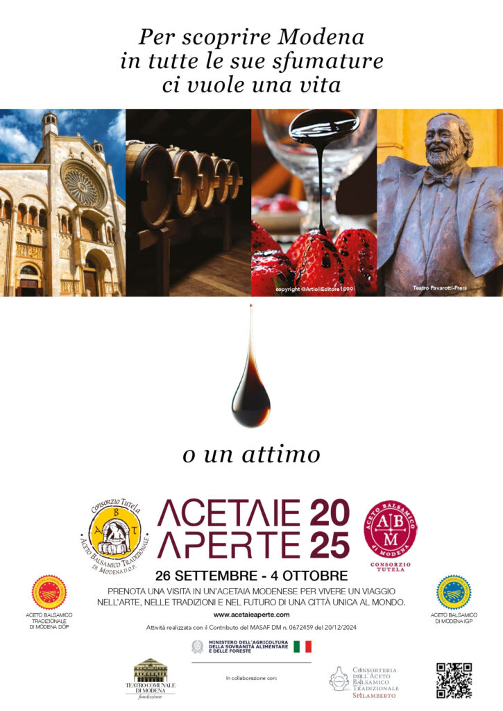 Ma la vera novità saranno proprio le collaborazioni messe in campo, a partire da quella con il Teatro Comunale di Modena Pavarotti – Freni dove venerdì 26 settembre si aprirà la rinnovata settimana di Acetaie Aperte con una delle opere più rappresentative, la “Bohème”. E dove, per ribadire la centralità del turismo e dei suoi asset, sabato 27 verrà presentato in anteprima – con tanto di tavola rotonda con rappresentanti delle Istituzioni nazionali – il primo Osservatorio “Turismo & Aceto Balsamico Tradizionale di Modena DOP e di Modena IGP”, in collaborazione con Roberta Garibaldi, Presidente Associazione Italiana Turismo Enogastronomico e autore del Rapporto sul Turismo Enogastronomico Italiano.