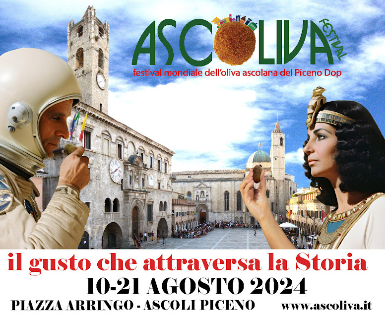 Ascoliva-Festival mondiale dell’oliva ascolana del Piceno DOP va in scena dal 10 al 21 agosto nell’incantevole scenografia naturale del centro storico di Ascoli Piceno, la città del travertino e delle cento torri. L’originale “claim” di questa undicesima edizione è “Il gusto che attraversa la Storia”, ispirato alla documentazione storica, in particolare ad un libro secondo il quale anche la regina egizia Cleopatra avrebbe gustato le olive ascolane, restandone conquistata.