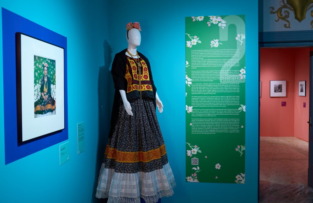 A sottolineare la profondità del legame tra i due, in mostra sono presenti anche alcune delle lettere che si scambiarono, in un rapporto fatto di amicizia, stima e amore, durato fino alla morte di Frida avvenuta nel 1954 all’età di 47 anni. Molte delle fotografie realizzate da Muray sono entrate nell’immaginario collettivo riferito a Frida Kahlo, ritraendola con i suoi caratteristici abiti tradizionali e accessori floreali, che in questa mostra occupano uno spazio a sé, grazie alla minuziosa ricostruzione di 8 abiti con relativi accessori e 6 parure di gioielli realizzate artigianalmente e che intendono restituire la potenza della comunicazione che Frida affidava ad un abito, ad un accessorio o a un gioiello, considerati come qualcosa di più di un mero oggetto estetico.