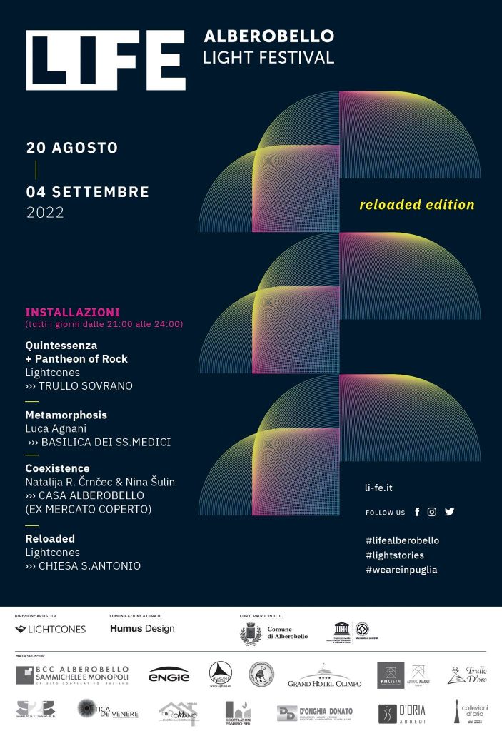 LiFe/Alberobello Light Festival riaccende i suoi colori dal 20 agosto al 4 settembre tutte le sere dal tramonto a mezzanotte per arricchire la già brillante estate di Alberobello e della Puglia intera.