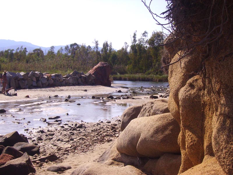 Interromperemo i nostri bagni solo all’ora di pranzo per dirigerci a pranzare al chiosco del nostro parcheggio. Pasto leggero e poi piccola pennichella. Il pomeriggio lo interrompiamo con lunga passeggiata lungo la spiaggia fino a scoprire che un piccolo ruscello sfocia proprio tra le rosse rocce e il suo letto è ricoperto di pietruzze dorate, chi sa forse attraversa una miniera d’oro?