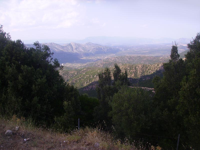 La strada ora si inerpica tra lande desolate e animate solo da pecore e pochi alberi fino ad raggiungere il paese arroccato di Dorgali; appena superato il paese abbandoniamo la statale 125 e imbocchiamo una galleria al di là della quale si apre il bellissimo panorama su Cala Gonone. Alcuni km di tornanti attraverso boschi di sugheri fino a una azzurrissima baia ed eccoci con un bel po’ di ritardo da quanto previsto all’Area Palmasera.