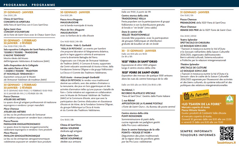 La Fiera di Sant’Orso non è, dunque, solo l’occasione per fare acquisti fra i mercatini senza tempo di Aosta, ma è l’esperienza dal fascino millenario per rivivere l’atmosfera di un tempo passato, con la possibilità di apprezzare tutte le eccellenze del territorio in una quattro giorni all’insegna della voglia di ritrovarsi e stare insieme.
