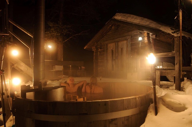 Soggiorno nel wilderness camp di Svansele nel pieno della foresta, senza elettricità nè acqua: cena a base di carne di alce e renna preparata al fuoco vivo in una delle capanne di legno, sauna e bagno in tinozze di acqua calda all’aperto.