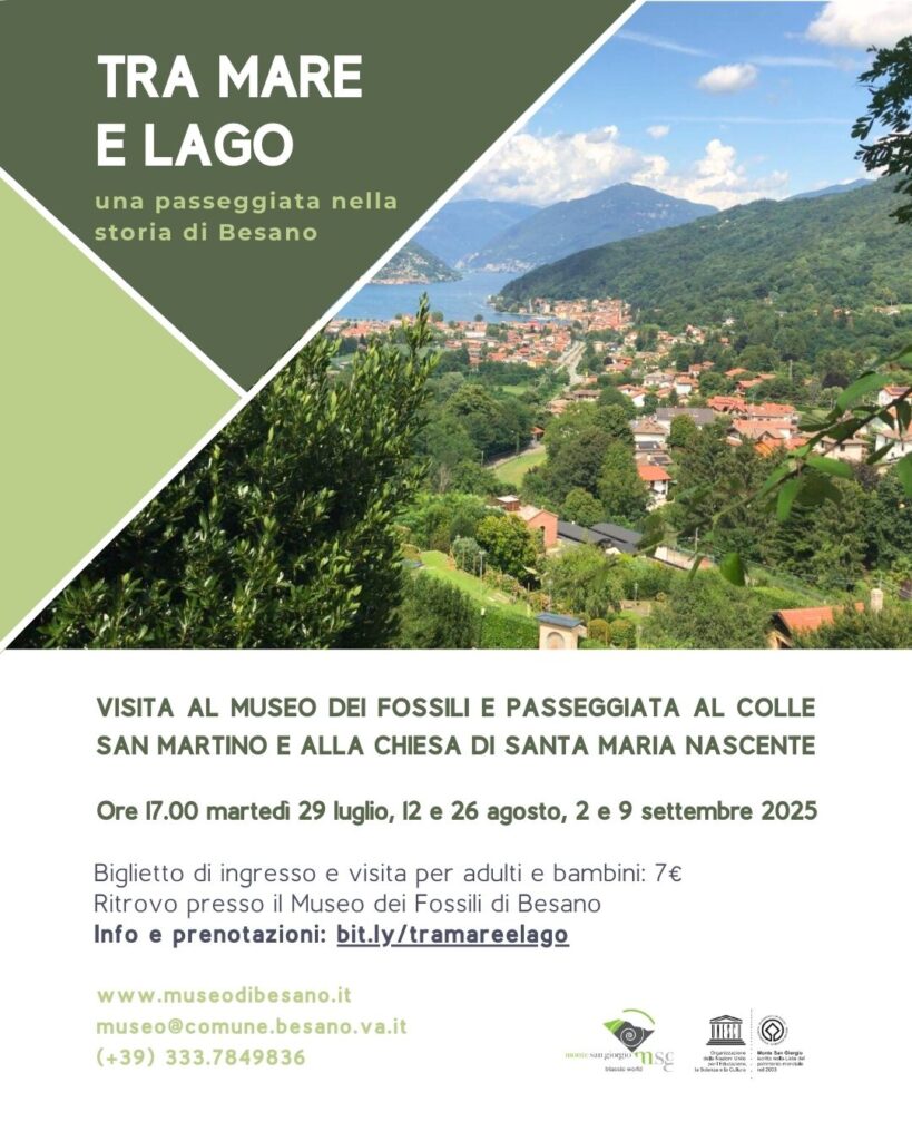 Le sfumature dei colori del lago e delle montagne, la brezza che rinfresca dopo le calde giornate, la curiosità di conoscere un passato e un presente del sito UNESCO del Monte San Giorgio: questo è il contesto in cui il Museo dei Fossili di Besano propone un ciclo di visite guidate dentro e fuori delle sue sale. Partendo dalla storia dei suoi fossili si andrà a ripercorrere la storia di Besano: dal bacino tropicale in cui vivevano ben 240 milioni di anni fa le creature che oggi possiamo ammirare perfettamente conservate nelle sale del museo, si arriverà al Colle San Martino, meta della passeggiata da cui si possono ammirare le placide acque del Lago Ceresio.