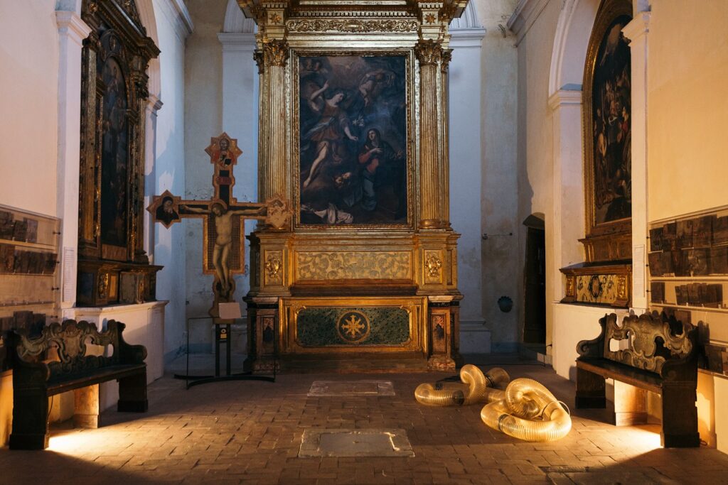 L’artista olandese Gabey Tjon a Tham nella chiesa di Sant’Orsola presenterà )))))repetition at my distance, una grande installazione cinetica, luminosa e sonora che indaga, in continuità e coerenza con la sua poetica artistica, il terreno comune tra la natura e il digitale nel modo in cui entrambi controllano le nostre vite attraverso cicli ininterrotti.