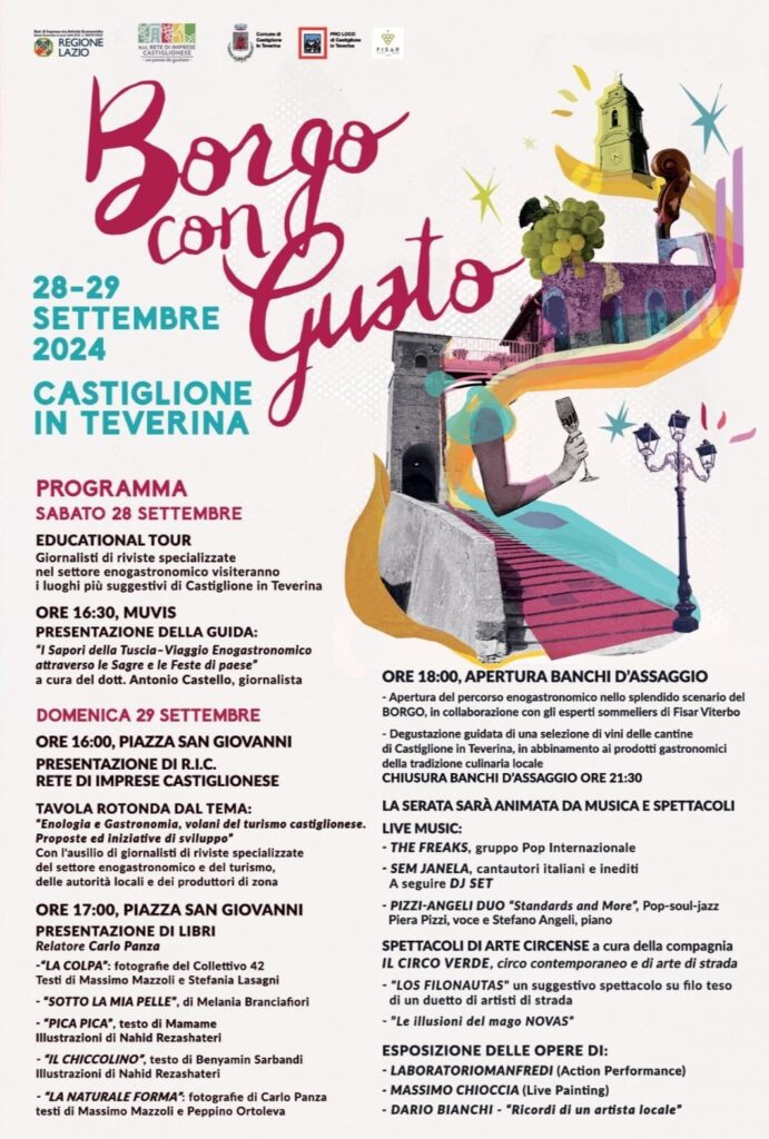 Si terrà il 28 e 29 settembre a Castiglione in Teverina (VT), tipico borgo della Tuscia situato su un colle, vicino al confine con l’Umbria e a pochi passi dal Fiume Tevere, immerso in un silenzioso paesaggio agreste, la manifestazione “Borgo con Gusto” promossa dalle Rete d’Impresa Castiglionese. Nel corso dell’evento avrà luogo anche un educational tour riservato ai giornalisti dell’enogastronomia nazionale. L’appuntamento è per Sabato 28, per una visita guidata al MUVIS, il “Museo del Vino e delle Scienze Agroalimentari” più grande d’Europa con 2000 m² di spazi espositivi, situato nel cuore del borgo. Il museo è inserito all’interno del vasto ed articolato complesso produttivo dei Conti Vaselli ovvero nella grande cantina distribuita su 5 piani (1° piano, piano terra e 4 piani sotterranei), non più in uso da quasi 20 anni. Il percorso è una discesa nella collina alla scoperta della produzione vinicola “di ieri”. Si scende per 27 metri sino a raggiungere la “Cattedrale” (al -4) in cui è possibile ammirare gigantesche botti del diametro di tre metri. Il programma prosegue nel pomeriggio con la presentazione della Guida “I Sapori della Tuscia” – Viaggio Enogastronomico attraverso le Sagre e Feste di paese – del giornalista Antonio Castello. Il giorno seguente, Domenica 29, il programma prosegue con una tavola Rotonda prevista per le ore 16.30 sul tema “Enologia e Gastronomia, volani del turismo castiglionese. Proposte e iniziativa di sviluppo” cui prenderanno parte esperti e giornalisti di settore. Al termine, in Piazza San Giovanni nel centro storico del borgo, ci sarà la presentazione di varie tipologie di libri, relatore Carlo Panza. A seguire, in Piazza Maggiore, la compagnia “Il Circo Verde”, presenta: “Los Filonautas”, un suggestivo spettacolo su filo teso di un duetto di artisti di strada, mentre in Piazza dell’Apollonia si potrà assistere ad uno spettacolo di illusionismo del mago “Novas”, mentre, nello splendido scenario del borgo, viene aperto il percorso enogastronomico con la collaborazione degli esperti sommelier di Fisar Viterbo, allietato dalla musica dal vivo di talentuosi musicisti con assaggi di vini e prodotti tipici locali.