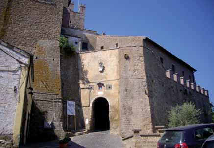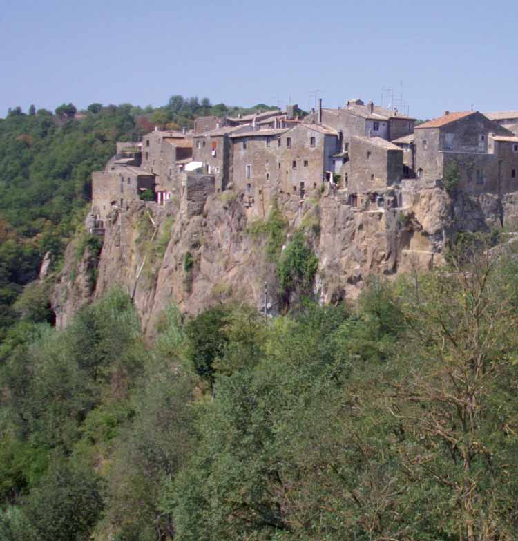 Le case sembrano nascere dalla roccia che s’innalza isolata in forma di tamburo circolare, traforato qua e là da antiche abitazioni trogloditiche. Al borgo si entra tramite una doppia porta ad arco sovrastata dalle mura merlate del palazzo baronale degli Anguillara, restaurato di recente.