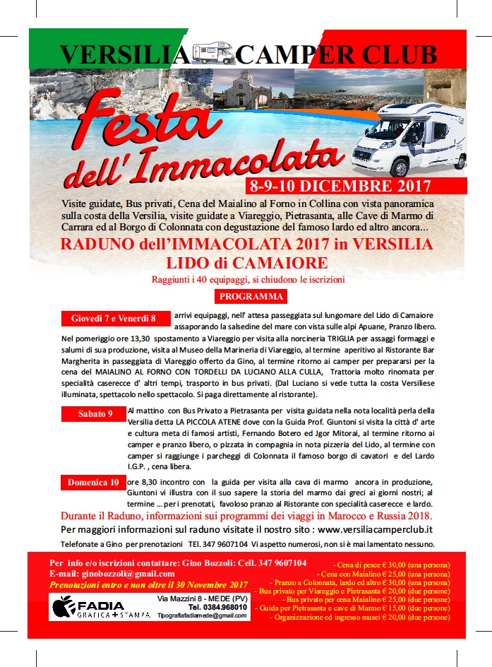 Giovedì 7 e Venerdì 8 Dicembre: arrivi equipaggi, nell’attesa passeggiata sul lungomare del Lido di Camaiore assaporando la salsedine del mare con vista sulle alpi Apuane, Pranzo libero. Nel pomeriggio ore 13,30 spostamento a Viareggio per visita alla norcineria TRIGLIA per assaggi formaggi e salumi di sua produzione, visita al Museo della Marineria di Viareggio, al termine aperitivo al Ristorante Bar Margherita in passeggiata di Viareggio offerto da Gino, al termine ritorno ai camper per prepararsi per la cena del MAIALINO AL FORNO CON TORDELLI DA LUCIANO ALLA CULLA, Trattoria molto rinomata per specialità caserecce d’ altri tempi, trasporto in bus privati. (Dal Luciano si vede tutta la costa Versiliese illuminata, spettacolo nello spettacolo. Si paga direttamente al ristorante).