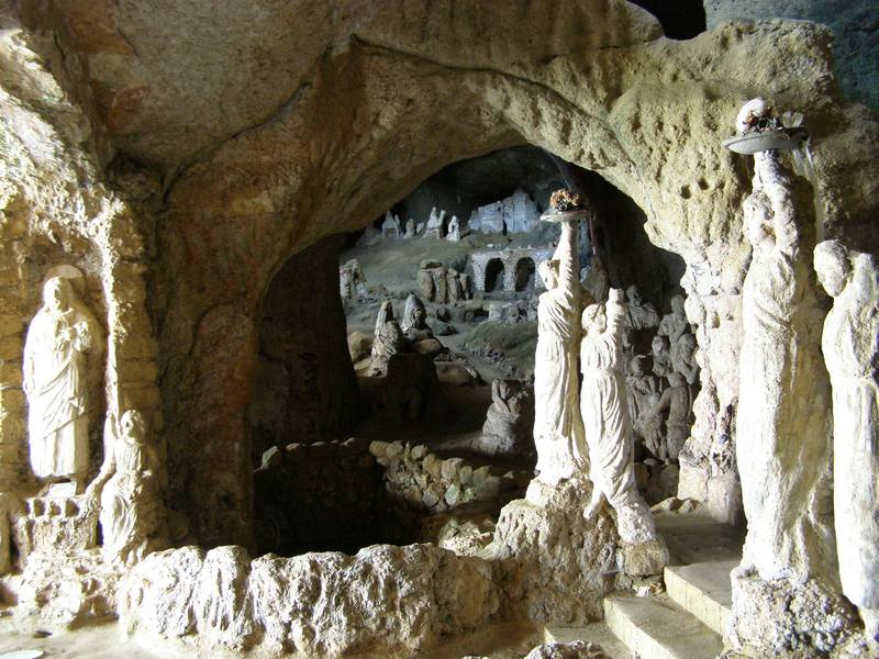 Verso il 1880, un artista locale, Angelo Barone, che aveva una piccola cartoleria al centro del paese, decise di dedicare la sua vita a quel luogo; ogni giorno raggiungeva a piedi il posto e a colpi di piccone ingrandì la grotta, ne creò altre due laterali e riempi gli ambienti di statue rappresentanti la vita di Gesù e dei Santi. Angelo morì il 19 maggio 1917, subentrò il figlio Alfonso che dedicò alla Chiesa 40 anni della sua vita. Per sua mano, essa assunse il suo aspetto definitivo. Egli scolpi altri gruppi di statue, capitelli con angeli, bassorilievi con scene sacre, affreschi sulla volta della navata centrale e su quella dell’altare maggiore. Alla sua morte non ci furono continuatori.