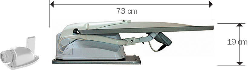 ● Unità di Comando DVB-S2 HD: con tensione di alimentazione 12/24 V in corrente continua, dimensioni compatte (160 x 115 x 25 mm) e display OLED, questa unità di comando consente di aprire e chiudere il disco dell’antenna e di avviare la ricerca automatica di uno tra i 16 satelliti preinstallati. L’unità dispone anche di una connessione Bluetooth con app dedicata ed è compatibile con i sistemi CI-BUS. È inoltre presente un sistema di sicurezza con chiusura automatica dell’antenna all’avviamento del motore.