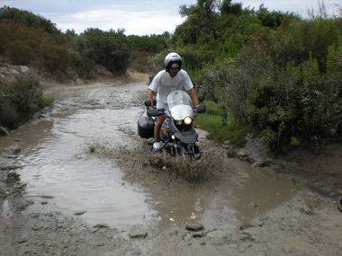Arrivati a destinazione ci aspetta il guado di una pozza d’acqua che regala alla moto quel tanto di fango che fa tanto adventure e al pilota il gusto “off” all’uscita. La spiaggia è fantastica, peccato solamente il celo velato che smorza i colori pastello meravigliosi che avevamo trovato nel 2009.