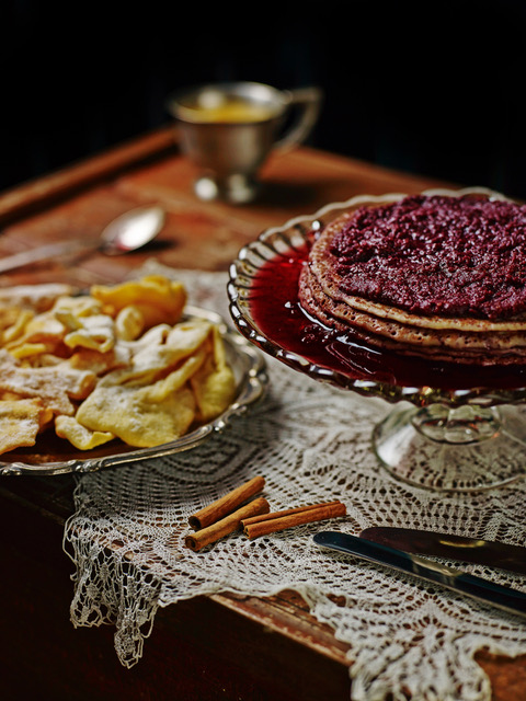 Per preparare l’impasto, sbattere 2 uova in mezzo litro di latte, con un pizzico di sale. Aggiungere mezzo bicchiere di refosco (o vino rosso), 3 cucchiai di farina setacciata e mescolare fino a ottenere un impasto liquido, ma cremoso. Per la farcitura, rosolare in un tegame, con 1 cucchiaio di olio o di burro, 2 mele grattugiate, 1 cucchiaio e mezzo di zucchero (o di miele) e una generosa presa di cannella fino ad ottenere una purea. La purea può anche essere sostituire con della marmellata. Dopo aver tolto la purea, nello stesso tegame, rosolare un paio di cucchiai di pangrattato con un po’ di burro e zucchero vanigliato, sfumando a fiamma alta con mezzo bicchiere di refosco e facendo evaporare bene l’alcol.