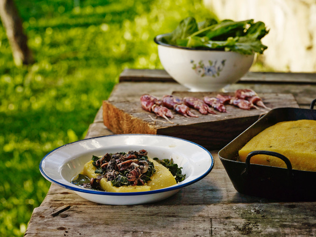 ammorbidirle. Aggiungere acqua, di tanto in tanto, e in un secondo tempo le biete lavate e tagliuzzate. Salare, pepare e cuocere lentamente fino ad ammorbidire le biete. Aggiungere acqua, se necessario, per ottenere la giusta densità. Preparare nel frattempo la polenta anche utilizzando la farina che cuoce in pochi minuti: in una pentola con acqua bollente salata, versare un quarto della farina di mais che si intende usare, mescolare aiutandosi con una frusta per evitare i grumi, versare il resto della farina, abbassare la fiamma, e cuocere, mescolando regolarmente con un cucchiaio di legno, facendo in modo che la polenta risulti morbida e cremosa. Poco prima della fine della cottura, aggiungere un cucchiaino d’olio d’oliva. Quando la polenta è cotta, versarla a specchio in un piatto da portata, ricavare un’incavatura al centro e adagiarvi le seppie con le biete e il loro intingolo.