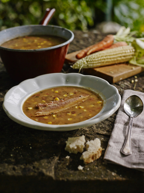 In una grande pentola, far soffriggere nell’olio d’oliva aglio e prezzemolo sminuzzati, aggiungere 2 patate pelate, e tagliate a tocchetti, 400 grammi fagioli borlotti, 3 cucchiai di chicchi di mais, 1 pezzo di carne di maiale affumicata (si può preparare anche senza o
