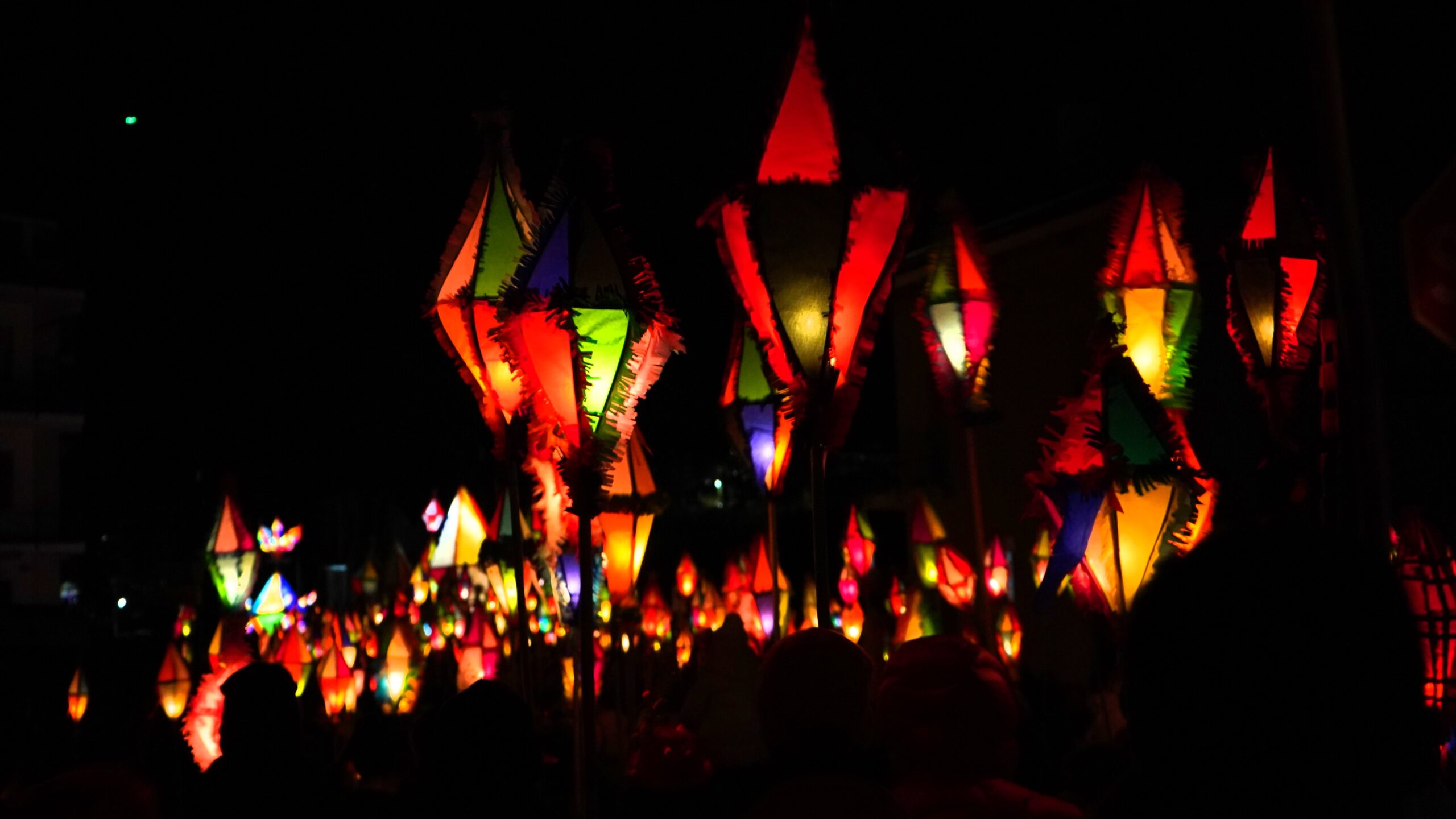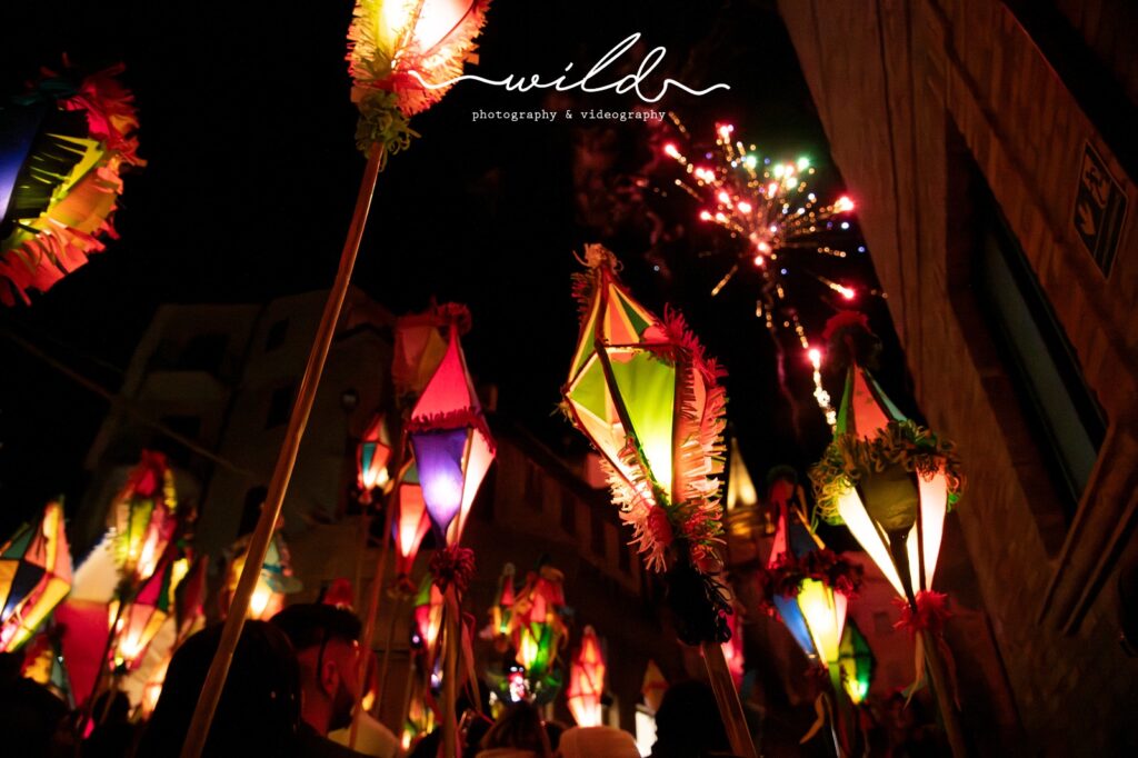Allo spegnersi dell’illuminazione pubblica prima centinaia e poi sempre di più fino a migliaia di lampioncini colorati si accenderanno: i Moccoli appunto, lanterne artigianali, ricavate da canne intagliate all’ estremità, ricoperte di carta velina colorata, con una candela fissata in mezzo e poi accesa. E così partirà la secolare sfilata, che si snoderà in gran parte del borgo e che al grido nel dialetto locale di “Fora fora li Moccule” e al ritmo delle percussioni concluderà la sua marcia nella piazza sommitale del Paese, Piazza San Pietro. Qui la battaglia finale tra Moccoli e poi il gran falò finale che ne deriverà, saranno l’epilogo, anche simbolico, di questa tradizione.