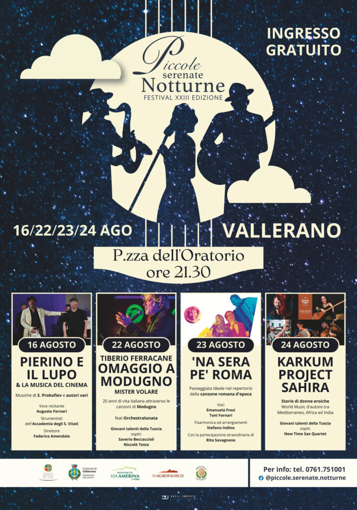 Martedì 22 agosto Vallerano omaggerà un grande artista della canzone popolare italiana, Domenico Modugno. Dopo la sua recente pubblicazione “MISTER VOLARE – 20 anni di vita italiana attraverso le canzoni di Modugno”, edito da Paola Caramella, l’autore Tiberio Ferracane, offrirà una performance narrativo-musicale accompagnato dai giovani talenti dell’Orchestralunata, insieme ai solisti Saverio Beccaccioli e Niccolò Testa.