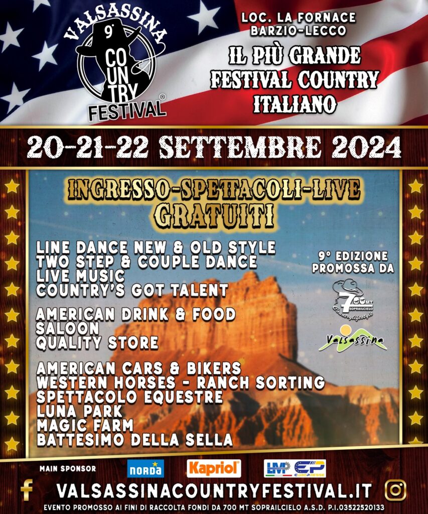 La favolosa epopea del West torna a rivivere nella famosa valle lombarda grazie al Valsassina Country Festival che, dal 20 al 22 settembre, vedrà la sua 9° edizione a pochi chilometri da Lecco nel comune di Barzio (LC), al confine con il comune di Pasturo (LC) in Località la Fornace.