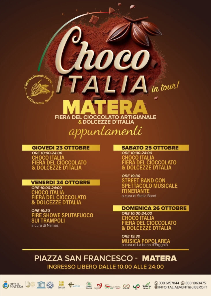 Saranno sei le regioni italiane protagoniste del mercatino di Choco Italia a Matera, tra cui proprio la Basilicata. Dalla grande tradizione del Piemonte arriverà una cioccolateria tradizionale, dall’Umbria – invece – l’azienda perugina che proporrà dolci sfere al fondente, al pistacchio, ai frutti rossi e le praline in vari gusti. Sarà il Molise a proporre il cioccolato senza glutine, senza lattosio e – novità di quest’anno – i cioccolatini al latte di bufala. Dalla Campania giungeranno dolci della tradizione, tanto miele biologico in diverse tipologie e specialità al miele. Immancabili la nocciola di Giffoni IGP ed il croccante preparato al momento, noci e mandorle, anche caramellate, così come i cremini colorati, i cioccolatini cremosi con ripieni diversi, tra cui alla Strega di Benevento e alla mela Annurca, ed il cioccolato grezzo senza zuccheri aggiunti. Dall’Agro nocerino sarnese un’antica dolceria porterà con sé biscotti, torroni e cioccolato e mostaccioli morbidi e ripieni, mentre da Portici tanti gusti di buon cioccolato artigianale. A divertire i più piccini tanti marshmallow, in vari gusti e tipologie, di un’azienda dolciaria artigianale napoletana. Irpini, invece, i tanti torroni tipici, disponibili in più gusti ed anche morbidi. Prodotta in Calabria la liquirizia e i tanti prodotti che ne derivano, tra cui liquori e caramelle.