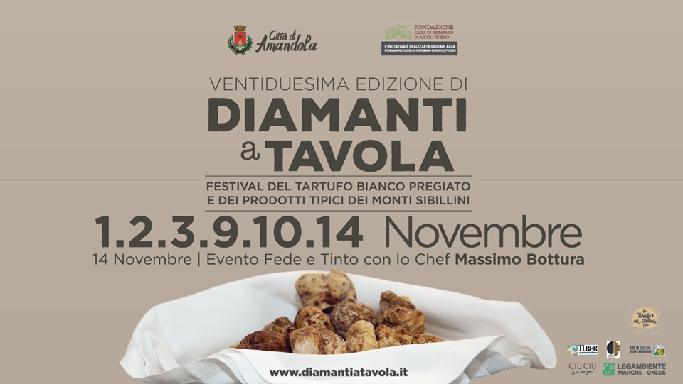 Da più di venti anni Diamanti a Tavola promuove e valorizza il più illustre frutto dei boschi di Amandola e dell’entroterra fermano. La manifestazione, realizzata dal Comune di Amandola insieme alla Fondazione Cassa di Risparmio di Ascoli Piceno nell’ambito del #masterplanterremoto, il piano strategico messo in campo dalla Fondazione per il rilancio delle comunità colpite dal sisma, vedrà il coinvolgimento di numerose personalità locali e internazionali, come nel caso dello chef Massimo Bottura che sarà presente ad Amandola giovedì 14 novembre e sarà intervistato presso Piazza Risorgimento alle ore 18:00 da Fede e Tinto, i popolari conduttori radiotelevisivi dei programmi Decanter (Radio Due).