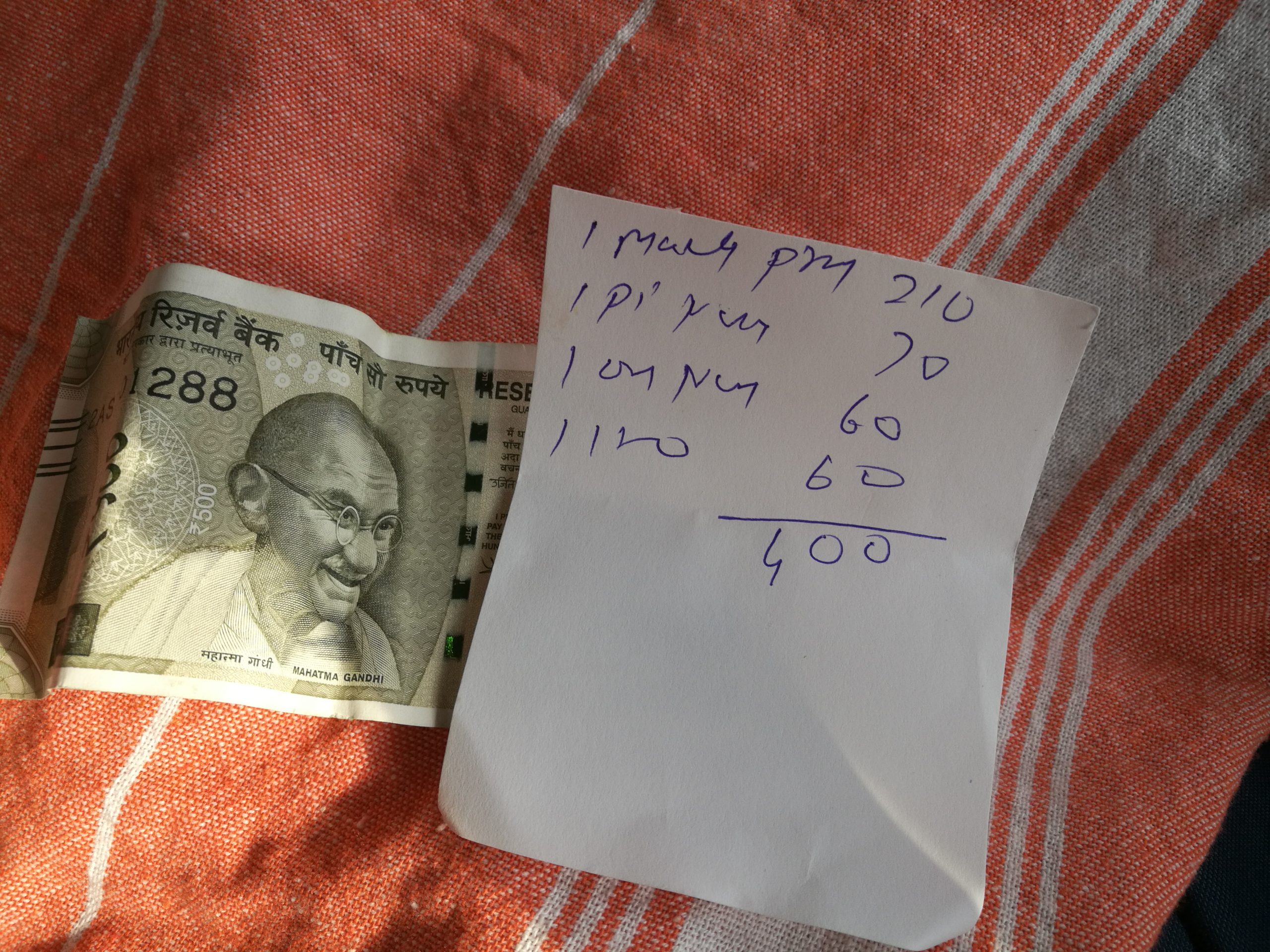 Il pranzo è squisito, per mia fortuna la maggior parte dei piatti sono vegetariani e posso godermi ogni singolo thali; scendo a compromessi con le spezie e il piccante e mi costringo a ordinare un’altra birra. L’unico ventilatore al soffitto fa quel che può ma non basta a rendere l’aria respirabile, nonostante tutto non vedo l’ora di andare via. Chiedo il conto, pago, raccolgo il resto e la ricevuta e raggiungo la macchina gialla che mi aspetta dall’altro lato della strada. Appena mi sistemo sul sedile posteriore apro le mani per fare un conto della spesa, osservo con sorpresa che la ricevuta è un pezzo di carta con quattro numeri in colonna mentre Gandhi ricambia il mio sorriso sulla destra delle mie 500 rupie color oliva e giallo.