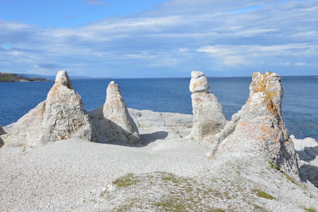 Non pensavamo che a queste latitudini potesse fare così caldo: alle 8 del mattino fa 18°C, alle 9 sono già 20°C! Il sole picchia forte (vedremo, in seguito, che lungo la costa norvegese, alle stesse latitudini, le temperature saranno sensibilmente più basse). Prima di lasciare Karasjok cerchiamo di visitare il Samedigi, cioè il Parlamento delle popolazioni Sami, ma è chiuso, perché aperto dalle 8,30 alle 15,30 solo nei giorni feriali (e oggi è domenica). Ancora tante zanzare. Peniamo un po’ per trovare un bancomat e lo troviamo entrando in paese tra la Coop e un distributore di carburanti (l’unico esercizio aperto, qui la domenica è tutto chiuso). Proseguiamo, sulla E6, con tratti di strada in rifacimento e si viaggia sul brecciolino. Il paesaggio comincia ad essere meno piatto, le strade hanno più curve e, quindi, la guida richiede maggior attenzione anche perché la strada presenta tratti ondulati e tratti rattoppati (in genere abbiamo constatato che le strade norvegesi non sono buone come quelle finlandesi e svedesi). Le piazzole di sosta sono abbastanza rare e, prevalentemente, sterrate, senza servizi se non il bidone per i rifiuti. Dopo Lakselv la strada comincia a correre sulla costa del Porsangerfijord; il panorama cambia decisamente, gli alberi quasi spariscono, il vento si fa sferzante e la foresta cede il posto alla tundra e, sulle coste, a distese di licheni. Pranzo in un ampio parcheggio, sulla strada, dove sono già molti camper (N 70°06’13” – 24°55’06”), accompagnati da un violento acquazzone con l’acqua che scendeva, a causa del forte vento, praticamente orizzontale. Ripreso il cammino, troviamo, sulla dx, l’indicazione per le Trollolmsund (formazioni rocciose bianche); sono 5 km di strada abbastanza dissestata che portano ad un parcheggio (N 70°17’57” – E 25°09’44”) dal quale, con 10 minuti di cammino si arriva alle curiose formazioni rocciose. Per arrivarci proseguire, a piedi, dal parcheggio fino alla prima casa sulla dx: una vistosa freccia rossa indica l’inizio del sentiero (seguire i paletti con la testa verniciata di rosso, passare un cancelletto e proseguire sempre seguendo gli stessi paletti).