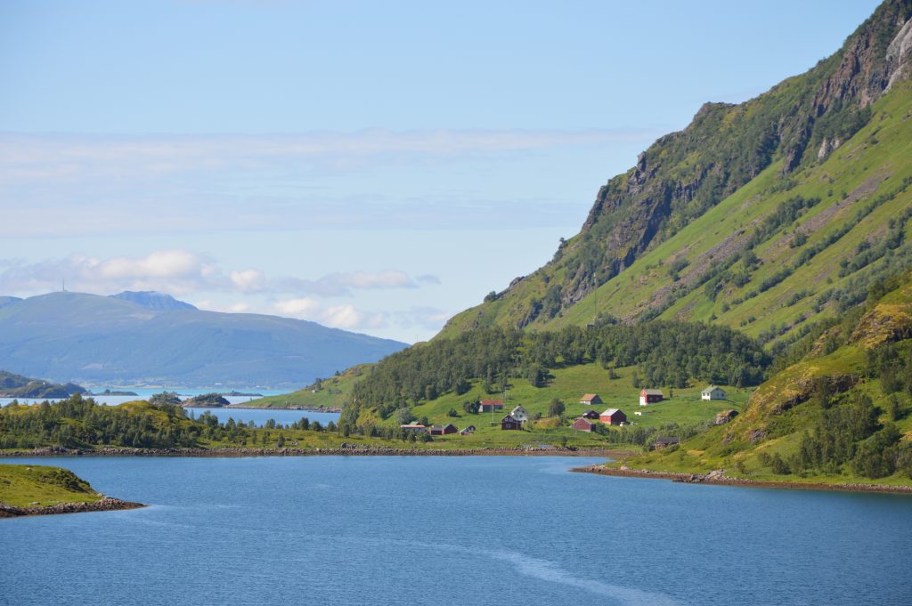 In 20 minuti siamo a Borg, al parcheggio del Vikingmuseum, ancora pieno di camper che vi hanno pernottato (nonostante la pendenza); in realtà, vedendo con più calma, notiamo in fondo al parcheggio (a sx entrando) un’indicazione di parcheggio per caravan e, dopo una breve salitella, c’è un piazzale abbastanza ampio (ovviamente pieno). Il museo (280 NOK, senior > over 60), assai interessante, oltre a ritrovamenti archeologici e un filmato sulla vita dei vikinghi, presenta, ed è il suo pezzo forte, la ricostruzione della casa del capo vikingo; oltre ad assistere all’opera di artigiani che lavorano, con arnesi dell’epoca, informando, con dovizia di particolari, i visitatori, è possibile mangiare piatti tipici. È anche possibile (tempo permettendo) effettuare una gita su una nave a remi vikinga. Il tempo si è fatto di nuovo nuvoloso e le nuvole, molto basse, hanno di fatto “decapitato” le montagne. È, purtroppo, giunta l’ora di lasciare le splendide Lofoten, un posto meraviglioso, nonostante che gli inevitabili cambiamenti sociali ed economici gli abbiano ridotto il fascino che dovevano avere fino a qualche decennio fa (vedi CONCLUSIONI) Purtroppo al porto di Svolvær non riusciamo ad entrare nel traghetto per Skutvik (come due camper davanti a noi) e, quindi, decidiamo di proseguire via terra. Arriviamo a Lødingen (lungo la E10 molte aree pic-nic) per tentare di prendere il traghetto per Bognes; arrivati, alle 17,40, all’imbarcadero, gli addetti ci garantiscono che riusciremo ad entrare, cosa che infatti avviene regolarmente alle 18,30 (30,86 € – 286NOK). Traghetto molto grande, bello e veloce nelle operazioni di scarico e carico. Ci fermiamo per la notte, alle 20,30, in un’AA presso il distributore di carburanti Shell di Innhavet; buona AA a terrazze con tutti i servizi (persino, rarità in Norvegia, la griglia di scarico per acque grigie e nere); si paga, solo con CC, al distributore.