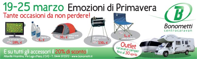 Da lunedì 19 a domenica 25 marzo, presso la sede di Altavilla Vicentina, Bonometti Centrocaravan offrirà ai visitatori l’opportunità di usufruire di occasioni imperdibili nel market accessori con prodotti ad un prezzo imbattibile! (www.bonometti.it)