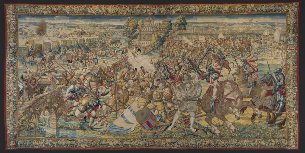 L’esposizione è stata organizzata nell’ambito delle manifestazioni per il Cinquecentenario della Battaglia di Pavia (24 febbraio 1525), un evento epocale che ha segnato la storia d’Europa, il primo grande scontro in cui le armi da fuoco furono decisive per l’esito finale e che aprì un nuovo capitolo nelle vicende dell’Italia e del Vecchio Continente. Punto di forza della mostra è la spettacolare raffigurazione visiva della battaglia, offerta dai sette arazzi monumentali del Museo e Real Bosco di Capodimonte a Napoli, eccezionalmente concessi tutti in prestito per l’occasione, tessuti negli anni 1528-1531 dalla manifattura fiamminga di Jan e Willem De Moyen su disegni di Bernard van Orley, per celebrare la vittoria delle truppe imperiali di Carlo V sull’esercito francese guidato da re Francesco I.