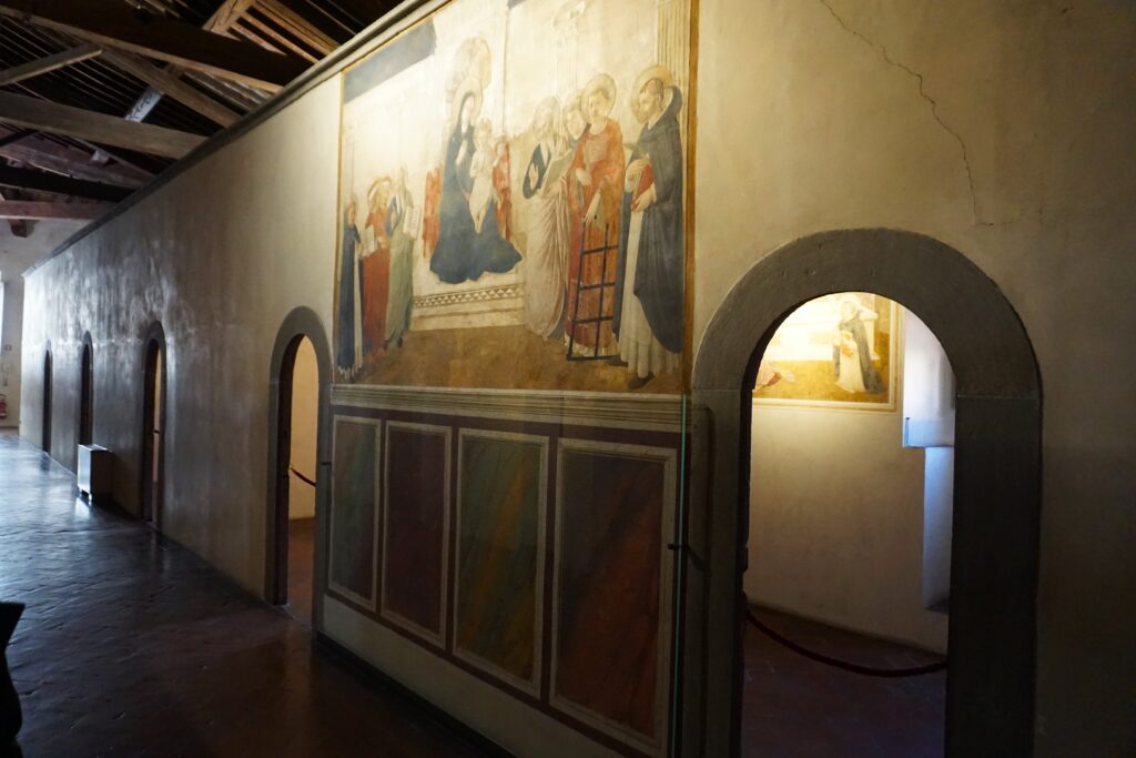 Guido da Pietro, nato a Vicchio nel Mugello nel 1395, si era trasferito a Firenze col fratello, per poi prendere il nome di Giovanni da Fiesole. Fu allievo di Lorenzo Monaco e inizialmente lavorò come miniaturista, sue le decorazioni sul Messale 558 visibile nella splendida Biblioteca del convento. Il termine Angelico gli derivò dalla fede, da quanto sia stata fondamentale nella sua vita e nel lavoro scelto, dipinse solo scene tratte dal Vangelo. Prese i voti nel 1420, diventando frate domenicano, poi priore. Beato lo diventò nel 1982 quando Papa Giovanni II gli attribuì l’onore di un gradino prima della santità. Conobbe sicuramente gli artisti del suo tempo come il rivoluzionario Masaccio che nell’affresco La cacciata dal Paradiso dipinge Adamo ed Eva secondo i rivoluzionari canoni rinascimentali. Sono nudi e la loro umanità è vista come una tragedia reale. L’uomo diventa l’artefice del proprio destino, non più vittima di un disegno divino. Il tema del Giudizio Universale, al contrario, viene interpretato dal Beato Angelico secondo i collaudati canoni medievali: i buoni da una parte, i cattivi dall’altra divorati da orrendi mostri, lo spartiacque fra i due opposti lo fanno i sepolcri aperti, realizzati attraverso una perfetta prospettiva rinascimentale. La committenza differenziava le sue opere, sfarzosi i dipinti, pieni di spiritualità gli affreschi del convento, edificio ricostruito dal mecenate Cosimo I de’Medici, lo stesso che si era appropriato di Palazzo Strozzi dopo avere sconfitto Filippo Strozzi in battaglia e averlo spinto al suicidio. Pur avendo visto quanto il potere temporale e quello religioso fossero spietati nella difesa dei privilegi, non mise mai in discussione la fede cattolica. Chiamato a Roma nel 1445 dal pontefice Eugenio IV, affrescò la Cappella Niccolina in Vaticano, lavorò anche per il suo successore Niccolò V. Morì a Roma il 18 febbraio 1445 ed è sepolto nella chiesa della Minerva.