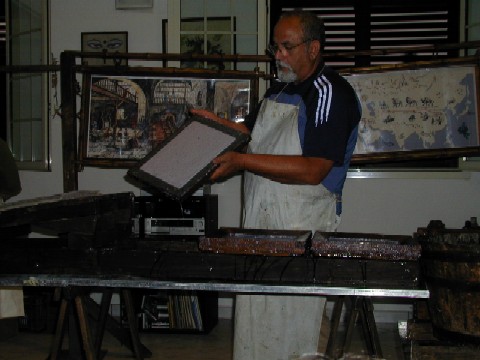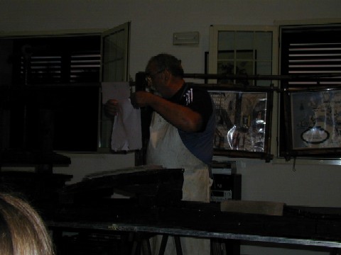 Foto 002: colazione (bufala) allo sguattero Foto 003: palazzo della cavallerizza a Novoli Foto 004: barocco leccese a Novoli Foto 005: il vecchio teatro di Novoli Foto 006: e tanto per cambiare Foto 007: ai bimbi non interessa il vino. Foto 008: .mentre sui grandi ha un certo effetto Foto 009: preparazione della carta Foto 010: ecco il foglio |