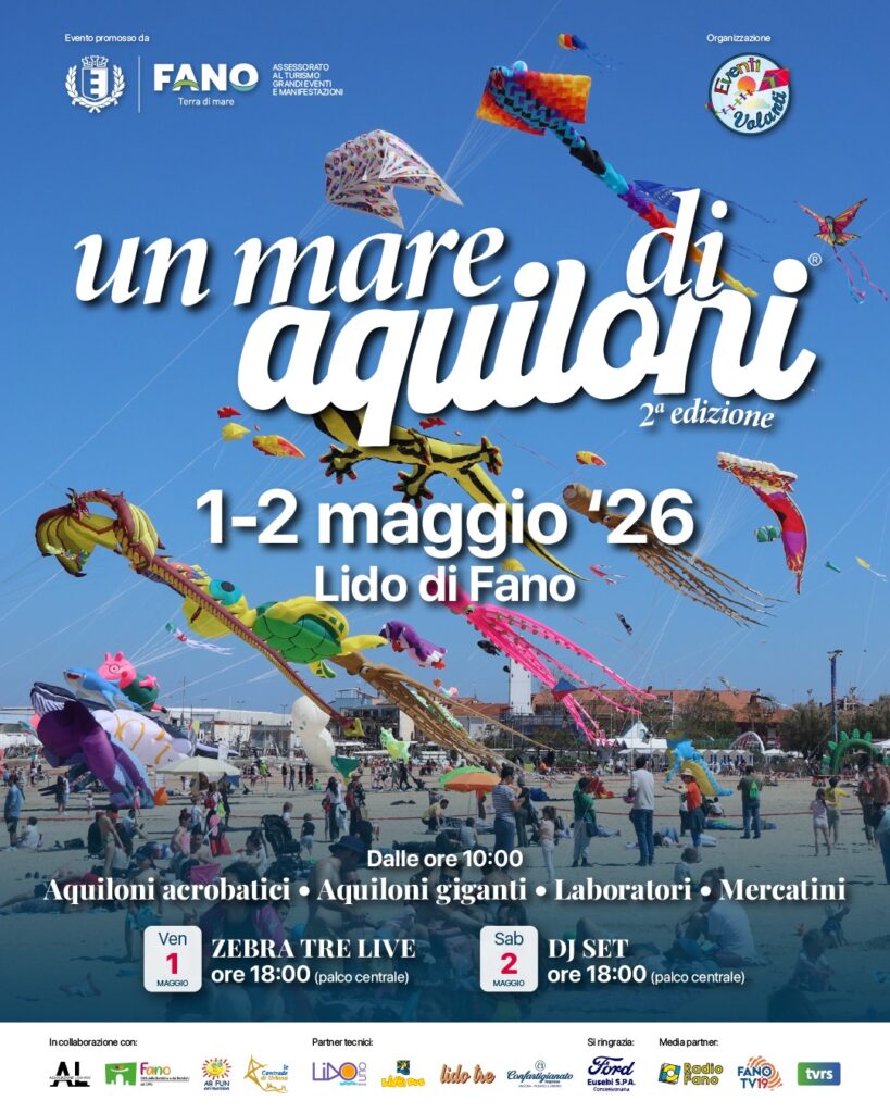Il cielo del Lido di Fano è pronto a trasformarsi in un suggestivo mosaico di colori in volo, un palcoscenico a cielo aperto con la seconda edizione di “Un Mare di Aquiloni”, evento per il quale si prevedono arrivi in città da tutta Italia tra professionisti, appassionati, famiglie o semplici curiosi. Appuntamento per le giornate dell’1° e del 2 maggio, con tanto di voli luminosi in notturna, grande novità di quest’anno, ad aprire nel migliore dei modi la stagione fanese con una manifestazione “che lo scorso anno ha sorpreso tutti per partecipazione e riscontro – evidenzia l’assessore ai Grandi Eventi, Alberto Santorelli – Ci auguriamo che anche questa volta Fano possa accogliere migliaia di visitatori: sarà un’occasione straordinaria per vivere la città, il mare e un evento capace di unire spettacolo, famiglie e promozione del territorio”.