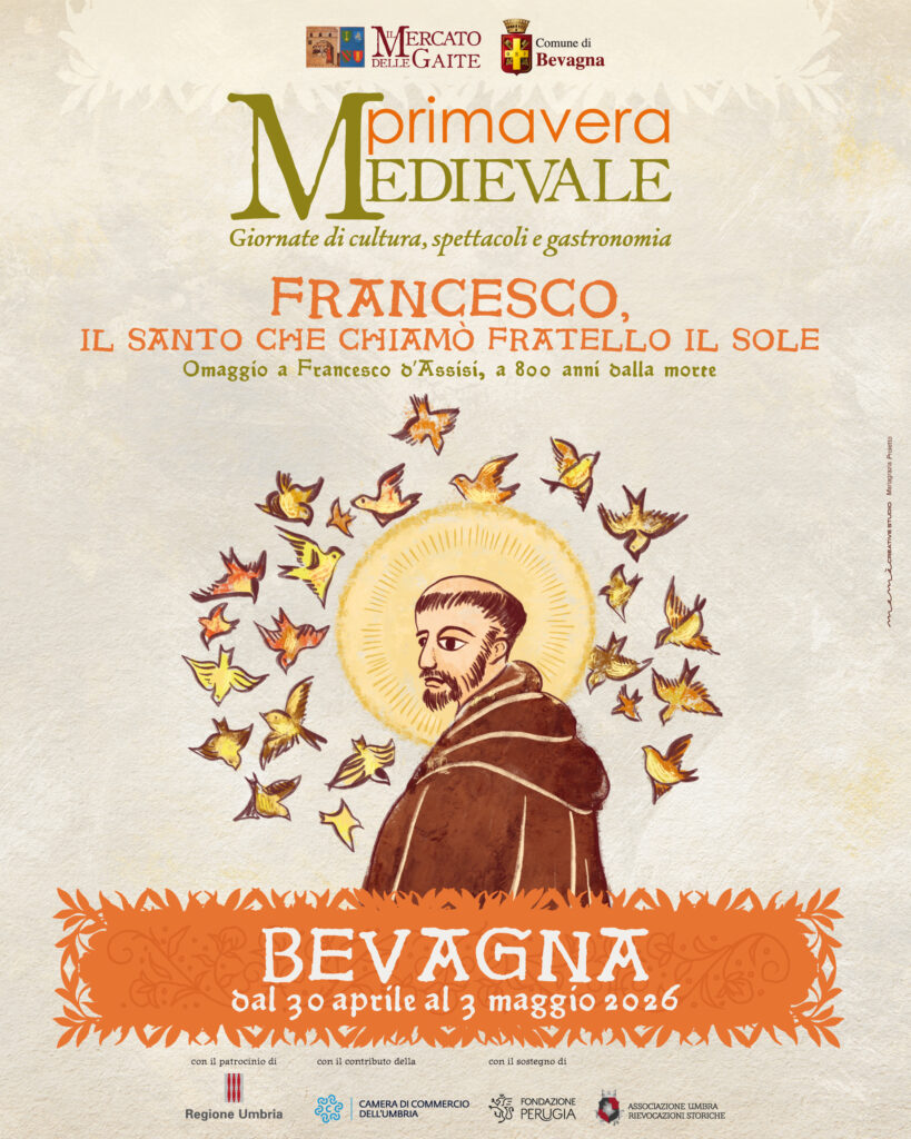 Appuntamento a Bevagna dal 30 aprile al 3 maggio prossimi con cultura, spettacoli e gastronomia. Il titolo e il tema scelto per la Primavera è “Francesco, il Santo che chiamò fratello il Sole – omaggio a Francesco d’Assisi, a 800 anni dalla morte”. Dal 30 aprile al 3 maggio, dunque, turisti e visitatori potranno trovare a Bevagna quasi un anticipo di quello che sarà il Mercato delle Gaite, con cultura e quindi convegni e conferenze, spettacoli suggestivi e le taverne delle Gaite aperte per regalare una esperienza unica. Non mancheranno i prelibati piatti delle quattro Taverne, i Mestieri Medievali, i giullari, i cantastorie e un ricco e colorato Mercato in piazza, con prodotti e manufatti, artigiani e mercanti.