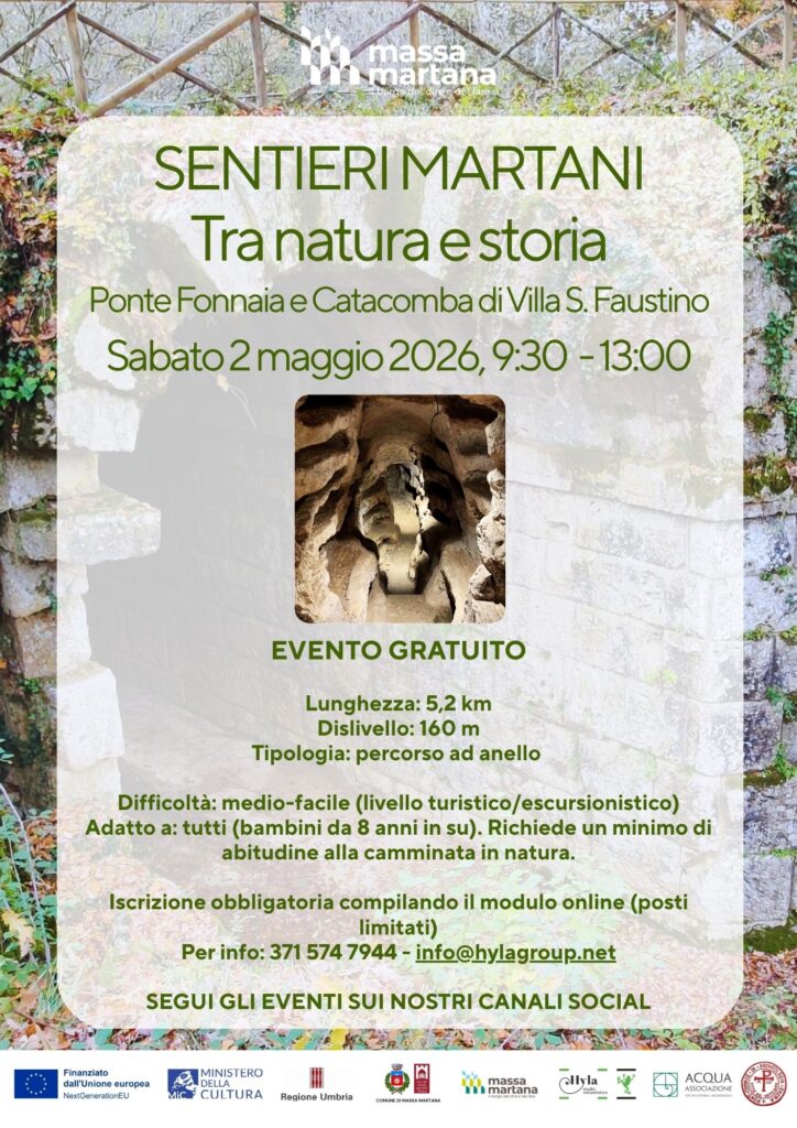 Sabato 2 maggio si prosegue con l’escursione intitolata “Tra natura e storia”: un viaggio unico tra natura e archeologia, tra le tracce antiche lasciate dall’uomo in un dialogo costante tra l’ambiente e secoli di storia. Il percorso svelerà luoghi di grande fascino come la suggestiva Catacomba di Villa San Faustino e vi condurrà lungo un tratto dell’antica Via Flaminia, dove sorge il meraviglioso Ponte Fonnaia. Ogni passo inviterà a riflettere sull’ancestrale identità di questo territorio.