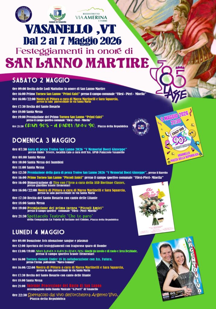 E’iniziato a Vasanello il conto alla rovescia per i festeggiamenti in onore del patrono San Lanno, che, come da tradizione, aprono il calendario dei grandi concerti in piazza. L’evento di punta dell’intero cartellone sarà il concerto dei Nomadi, una band che ha fatto la storia della musica italiana che si esibirà, in un live gratuito, il prossimo 6 maggio.