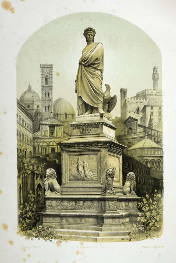 Le celebrazioni dantesche tenute nel 1865 a Firenze, da pochi mesi scelta come nuova capitale, rappresentano la prima grande festa nazionale del Regno d’Italia. I festeggiamenti coinvolsero tutte le principali città dello stivale, comprese quelle che ancora si trovavano sotto il dominio austriaco o, come nel caso di Roma, sotto quello pontificio. In questo contesto furono pubblicati giornali e riviste che rendevano conto delle molteplici iniziative legate all’anniversario e nella biblioteca Moreniana ne sono conservate molti.