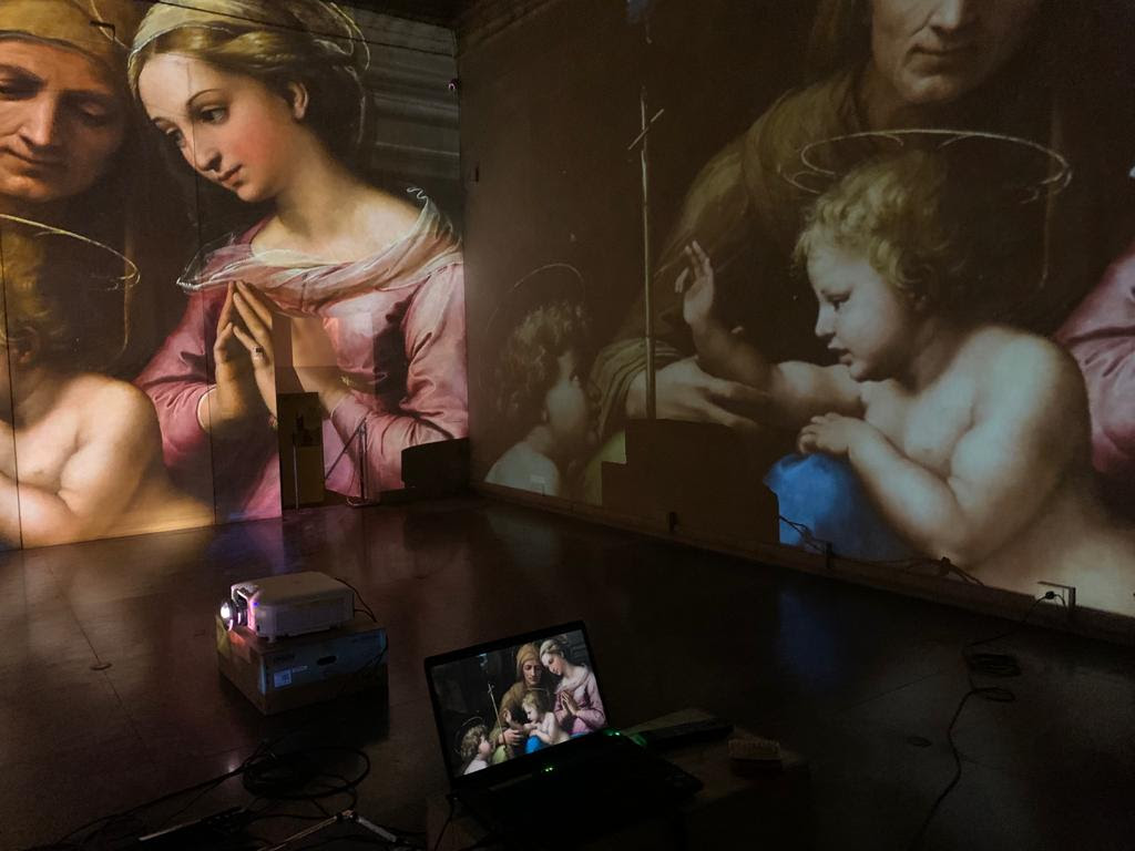 La ricchissima parte multimediale ricostruisce con immagini accompagnate dalla descrizione artistica e storica che le contestualizza tutte le dodici opere realizzate da Raffaello in Umbria – dove oggi ne rimangono soltanto due, con le altre sono dislocate nei musei in giro per il mondo; inoltre, mette in scena due dialoghi realizzati da attori che interpretano l’artista mentre si confronta con suo padre e con il suo maestro Pietro Vannucci, detto il Perugino. Si inseriscono nel percorso anche tre opere del Rinascimento umbro appartenenti alla collezione della Fondazione Cassa di Risparmio di Perugia e realizzate da tre maestri a cui Raffaello si ispira e con i quali si relaziona quando arriva in Umbria: Perugino, Pintoricchio e Signorelli.