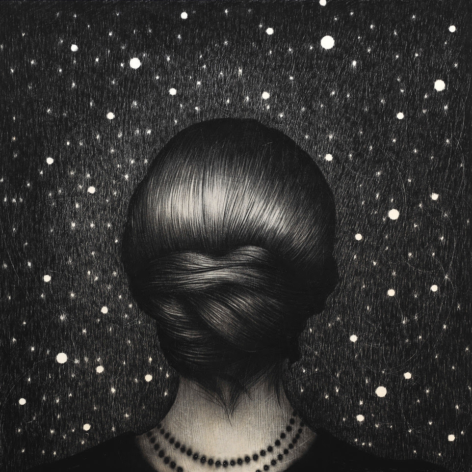 Questo legame con il territorio è ancora una volta testimoniato dall’inedita sezione realizzata appositamente da Galliani per questa esposizione ascolana – e che da essa prende il titolo – ispirata al mito della Sibilla Picena, anche nota come Sibilla Appenninica, immagine identitaria del territorio: tra le vette dei Monti Sibillini dimorava una donna di straordinaria bellezza, interlocutrice tra il cielo e la terra, tra il divino e l’umano. Sulle tavole in mostra riecheggia la poetica celeste dell’artista, legata a cieli infiniti e a universi di stelle lontane. Le sibille di Galliani sono donne di grafite con occhi serrati, colte nel profondo momento di meditazione. Sul volto di queste enigmatiche figure compare, incisa come un tatuaggio di pigmento rosso, la lettera a: l’inizio della profezia, l’origine del tutto.