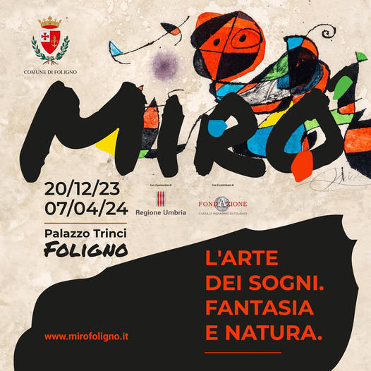 Palazzo Trinci, a Foligno, ospita, dal 20 dicembre fino al 7 aprile prossimo, 47 opere di Joan Mirò – esponente spagnolo di spicco del surrealismo – tra litografie e serigrafie, realizzate negli anni’70. Si tratta di due serie realizzate a Palma di Maiorca: la prima, intitolata “Serie Mallorca”, fu esposta nel 1973, esattamente 50 anni fa e si compone di quattro gruppi di 9 opere ciascuna, di cui due in monocromia (bianco e nero) e due a colori mentre la seconda, la “Serie Gaudì”, dai colori fluorescenti, Miró la dedicò al suo grande amico e architetto spagnolo, autore della “Sagrada Familia” di Barcellona.